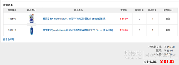 京東移動端目前這款售價60元,參加2件7折活動,湊單這款售價56.9元的曼秀雷敦 新碧戶外冰涼防曬乳液 35g,2件折后實際支付81.83元,單防曬噴霧蘇寧就報價89.9元,防曬乳液也要40元左右,目前兩款折合下來很劃算,炎熱的夏天已經(jīng)漸漸逼近,外出這貨用的上。