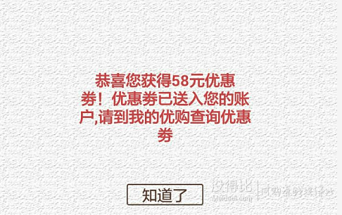 下載手機app,搖一搖得到58元優(yōu)惠券,配合之前問卷調(diào)查得到的40元禮品卡,找一些可以用券的商品,可能會有0元單。