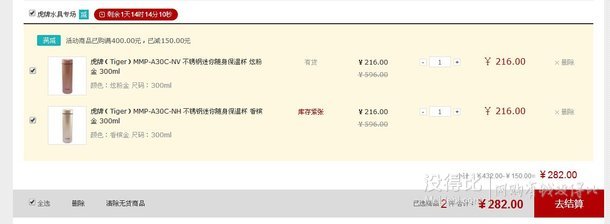 虎牌迷你保溫杯(300ml)現(xiàn)京東報價216元,并且參加滿200-40和滿400-150優(yōu)惠活動??梢韵聠蝺芍徊煌伾?a href="http://www.tyanime.cn/Outlink/any?url=http%3A%2F%2Fitem.jd.com%2F1360076.html" target="_blank" rel="nofollow">香檳金和炫金色),滿減后實付282元(平均141元/只),近期低價,多色可選,庫存充足。同款亞馬遜中國500-100活動后248元。