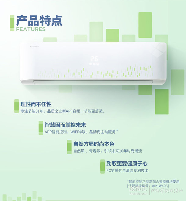 這款科龍空調(diào)型號為KFR-35GW/EFQGA3,規(guī)格1.5匹,隸屬于雙效王天籟系列,采用全直流變頻技術(shù),R410a環(huán)保制冷劑,10~150Hz寬幅變頻,宣稱溫差不高于0.5度;帶有FC自動清潔技術(shù),可以省去清潔空調(diào)的煩惱;DDF雙核雙控,雙芯片分別控制壓縮機(jī)和風(fēng)扇,制冷制熱更高效。除此之外,產(chǎn)品主打智能控制,可以通過手機(jī)APP連接智能模塊,從而達(dá)到遠(yuǎn)程控溫、一機(jī)分控等多種功能。數(shù)據(jù)配置方面,支持電輔加熱,APF三級能效,室外機(jī)重量31kg,室內(nèi)噪音39dB,能效比3.72。