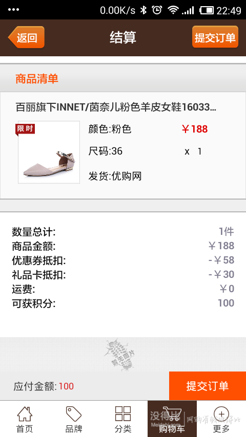 金屬腳踝,搭扣設(shè)計好穿脫全羊皮鞋面柔軟,有質(zhì)感尖頭鞋型,時尚優(yōu)雅.還記得搖一搖的58元券?這款鞋現(xiàn)188用58優(yōu)惠券(移動端可用PC端不可用)30禮品卡(發(fā)到老用戶帳號里的或沒得比40禮品卡).實測下單100元.