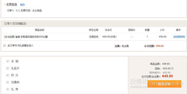 雀巢 安骼高鈣高鐵奶粉800g/罐,當(dāng)當(dāng)售價(jià)99.9元,參加滿99減50,實(shí)付49.9元包郵,其他渠道至少都在73元以上。