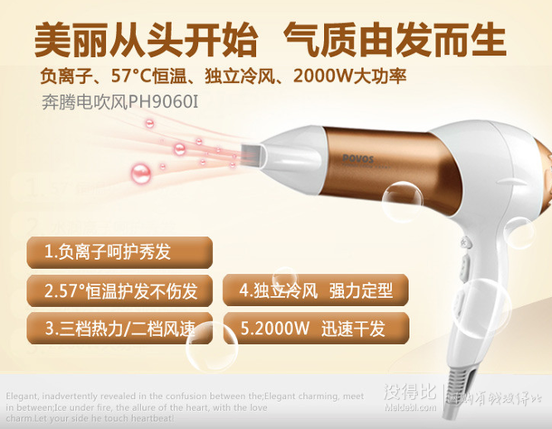 POVOS奔騰電吹風(fēng)機(jī),型號(hào)為PH9060I,采用57℃恒溫技術(shù),水潤(rùn)負(fù)離子(比一般的吹風(fēng)機(jī)更加護(hù)發(fā)),三檔風(fēng)速可調(diào),冷熱風(fēng)可切換,2000W大功率輕松搞定長(zhǎng)發(fā),具備漏電保護(hù)和過熱保護(hù),安全更可靠。
