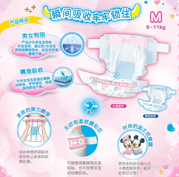 媽咪寶貝(Mamypoko)瞬吸干爽紙尿褲 女 中號(hào)M240片 6-11kg 。采用男女分用設(shè)計(jì),男寶寶藍(lán)色,女寶寶粉紅色,配合迪斯尼卡通人物圖案,讓寶寶在換褲中享受更多快樂(lè),材料采用無(wú)紡布、絨毛漿、吸水紙、高分子吸收樹(shù)脂、聚烯涇薄膜,添加瞬吸干爽層,柔軟的背部彈性腰圍,舒適的襠部窄型設(shè)計(jì),使寶寶的小屁屁更加干爽舒適。