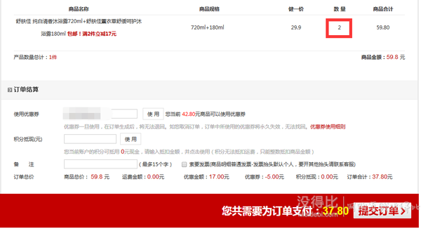 目前Safeguard 舒膚佳 純白清香沐浴露720ml+薰衣草沐浴露180ml 裝,健一網(wǎng)限時特價¥29.9,購買2件可再減17元,還可疊加沒得比提供的¥5優(yōu)惠券,購買2件滿減疊加券后實付¥37.8包郵,折合¥18.9/件,同款亞馬遜最低¥27.1/件。