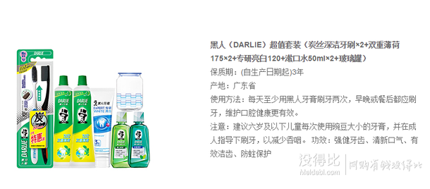 DARLIE 黑人牙膏是在超市常見的品牌,產品也比較受認可。這款套裝包含雙重薄荷牙膏175g×2支+專研亮白120+炭絲深潔牙刷×2+漱口水50ml×2+玻璃罐。牙膏有效潔白牙齒,去除牙菌斑,含有氟化物。牙刷刷毛柔軟,有效清潔牙縫深處和口腔。