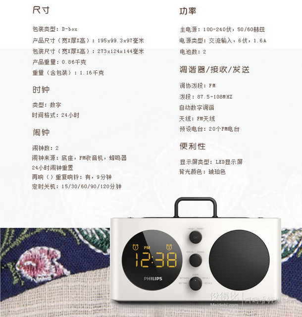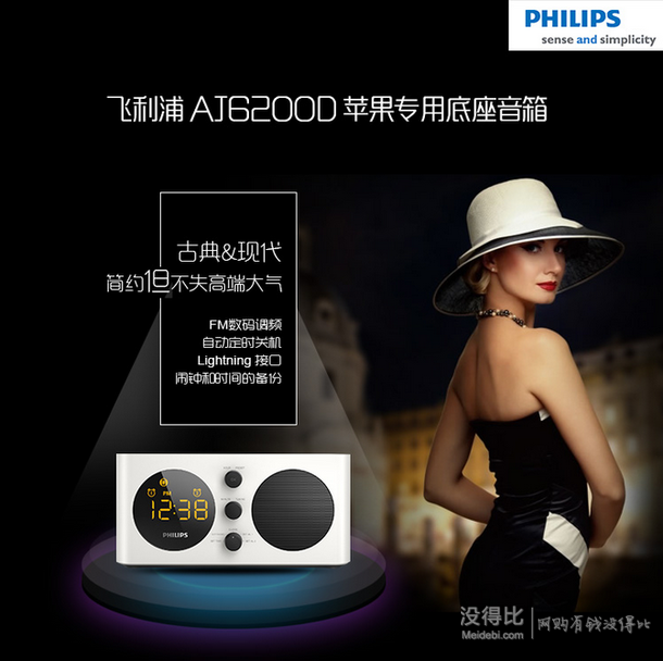 飛利浦 AJ6200D 蘋果iPhone6/5/5s音樂(lè)充電基座音響,采用復(fù)合材料外殼,富于質(zhì)感而且輕盈;為您的第二臺(tái)USB設(shè)備充電;領(lǐng)夜光液晶顯示屏可設(shè)鬧鐘和調(diào)節(jié)明暗程度;支撐架預(yù)防蘋果設(shè)備可能導(dǎo)致的外觀損傷。古典&現(xiàn)代,簡(jiǎn)約但不失高端大氣。造型上簡(jiǎn)約時(shí)尚,將音箱和鬧鐘巧妙結(jié)合,讓您每天在美妙音樂(lè)中醒來(lái)。人性化可預(yù)設(shè)FM數(shù)碼調(diào)諧,Lighting接口快速充電。