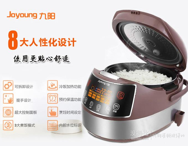 九陽JYF-40FS09智能電飯煲,采用2mm厚陶晶內(nèi)膽,商品頁面介紹三有維立體加熱,但從網(wǎng)友評(píng)價(jià)來看可能并沒有,可拆卸內(nèi)蓋便于清洗;電腦控制,支持24小時(shí)預(yù)約;另有多種口感可供選擇,并設(shè)有防燙提手,貼心實(shí)用。4L容量,3級(jí)能效,普通家庭2-4人足夠使用。