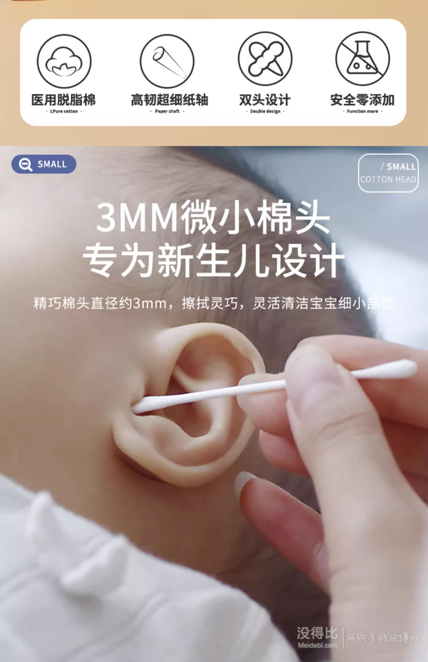 哇愛(ài) 嬰幼兒棉簽雙頭紙軸 200支*3罐,棉簽高7.2cm,棉頭3mm,比較小,貼心呵護(hù)嬰兒小部位的哦,棉簽為紙桿手柄,紙質(zhì)棉簽棒的優(yōu)點(diǎn)是光滑無(wú)毛刺,可隨意彎曲不折斷,溫柔對(duì)待寶寶嬌嫩肌膚,棉頭也是采用天然長(zhǎng)絨棉纏繞而成,無(wú)熒光劑無(wú)粘合。